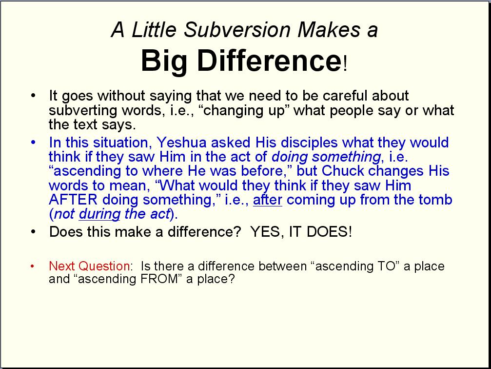 Of course, adding the word “from” to the interpretation is only one of the major issues I have with what Chuck does to the context. Another is his promoting the view that Yeshua didn’t really expect His disciples to physically see Him during His ascension; no, according to Chuck, the “seeing” took place afterwards. This goes beyond being an innocent misunderstanding of Yeshua’s words; it can only be viewed as deliberate manipulation. 8. The following slide is another visual aid designed to further drive home my point that Chuck is guilty of subverting Yeshua’s words. Some may argue that this topic is now heading into “overkill,” and I get their point; at the same time, there may be one person out there who needs to see things from a slightly different angle before things start to “click.” If you’re that person, then the following slides are for you: