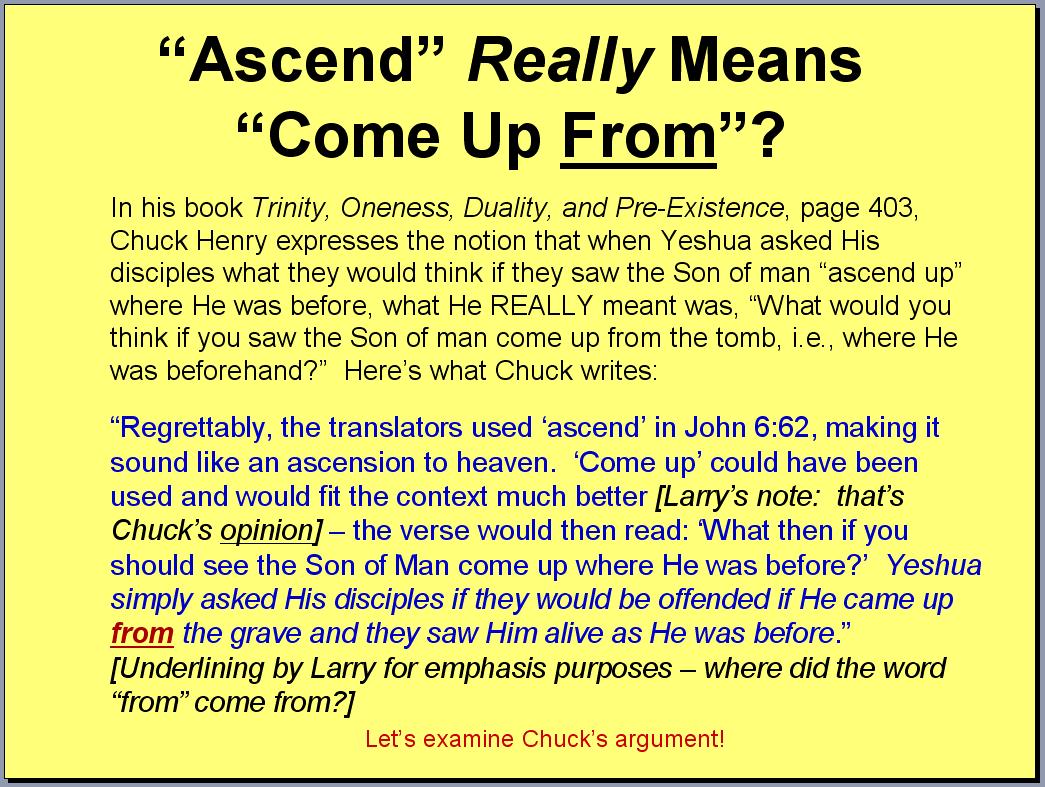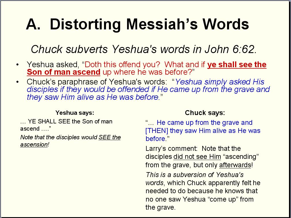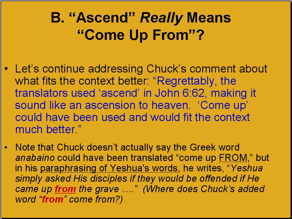 In reading Chuck’s quote, please note that the word “from” in Greek is the word pronounced “ek” and this Greek word does not appear in John 6:62. Notice that Chuck is careful to not add the word “from” to the actual text, but he freely uses it in his interpretation of the verse. I’m sure Chuck feels his approach helps to clarify the author's intent. I call it “adding to the Word interpretationally,” but it’s probably more accurate to just call it what it is – twisting Scripture. Chuck’s radical approach reminds me of the child who was told her grandmother quit smoking “cold turkey.” Not being aware of the significance of this idiomatic expression, she came away with the impression that her grandmother quit smoking by eating cold turkey. Soon afterwards, when she heard of a friend’s relative who was trying to quit smoking, she suggested that he try eating cold turkey. She thought she understood the potential solution to the smoking problem, but she innocently got it wrong, much to her embarrassment. Eating cold turkey will not help anyone kick the smoking habit. I’m hoping Chuck’s “potential solution” is as innocent as the child’s, but we need to be ultra careful when the “potential solution” involves an interpretation of the Bible, and especially when rejecting the interpretation results in a charge of “potential idolatry.” In the above example, the child didn’t hear anyone say the words “by eating” within the phrase “stop smoking cold turkey.” No one said, “He quit smoking by eating cold turkey,” but that’s what her brain told her the speaker must have meant. She was mistaken. In the same way, Yeshua didn’t ask His disciples what they would think if they saw Him after He rose from the grave, yet that’s what Chuck’s brain tells him Yeshua must have meant. I’m afraid Chuck is just as mistaken with his attempt to “fill in the blanks” as was the child who thought “quitting cold turkey” requires eating cold turkey. Chuck can either be embarrassed about his misperception now or later.Moreover, please consider the complete overhaul of context perpetrated by Chuck. In context, Yeshua had just stated that He descended from heaven, which created quite a stir among His fellow Jews. Even His disciples were perplexed when He proceeded to speak of “eating His body,” so if that’s all it took to offend them, He asked what they would think if they saw Him ASCEND to where He was before. In context, where He was saying He was before is HEAVEN, and if He ASCENDS to where He was before, that means He would be ascending to heaven. We know from Acts chapter 1 that the disciples did indeed physically see Him ascending to heaven. It all fits! But out of context, Chuck has Yeshua telling the Jews that all good things come from above, and oh, by the way, what will you think if you see me AFTER I’ve ascended from the grave? I couldn’t believe my eyes when I read this commentary from Chuck on page 403 of his book, but it sounded all the more bizarre hearing it in person when we had our preliminary debate back in March. This is truly what Chuck believes. Below is a PowerPoint slide that I prepared in hopes that I could include it with my debate presentation. As with all slides in this “Where He Was Before” section, it wasn’t used. It shows how Chuck confuses the word “raise” with “ascend,” then attempts to transfer the application of “raise” to John 6:62: