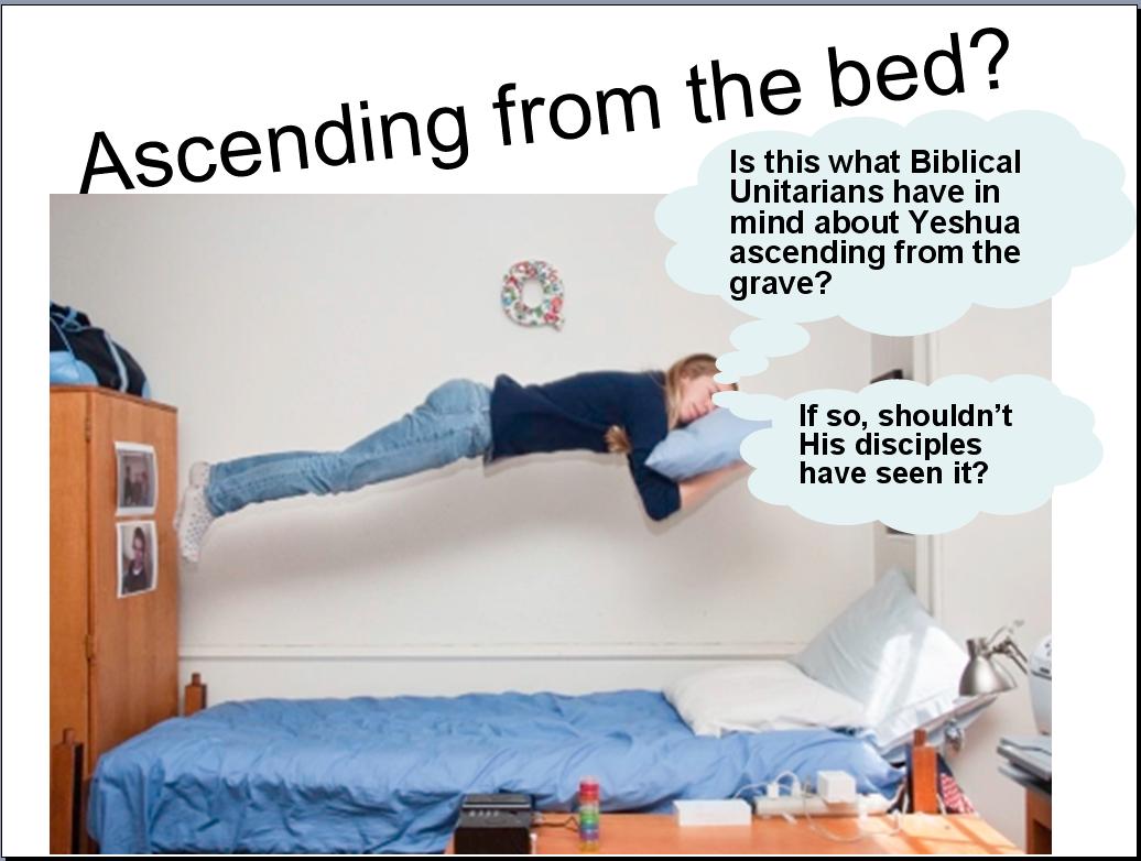 As I mentioned previously, there’s a big difference between seeing Yeshua ascend versus seeing Him after He ascended. A little subversion truly makes a big difference. Hellenistic 10. The following slide asks a major question that I don’t think Chuck can answer: “If ‘come up’ fits the context better than ‘ascend’ (as stated by Chuck), then why does Chuck need to add the word ‘from’ in his attempt to clarify the context?” Here, once more, are Chuck’s exact words as found on page 403 of his book: “Yeshua simply asked His disciples if they would be offended if He came up from the grave and they saw Him alive as He was before.”