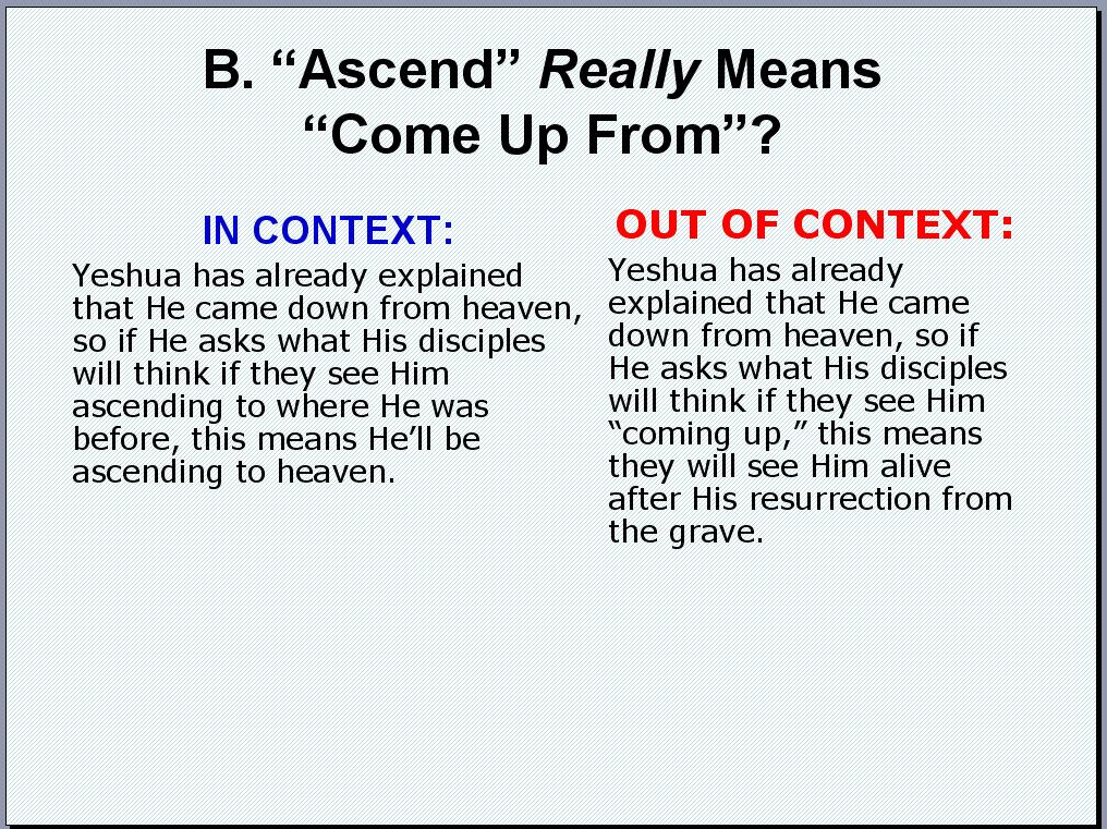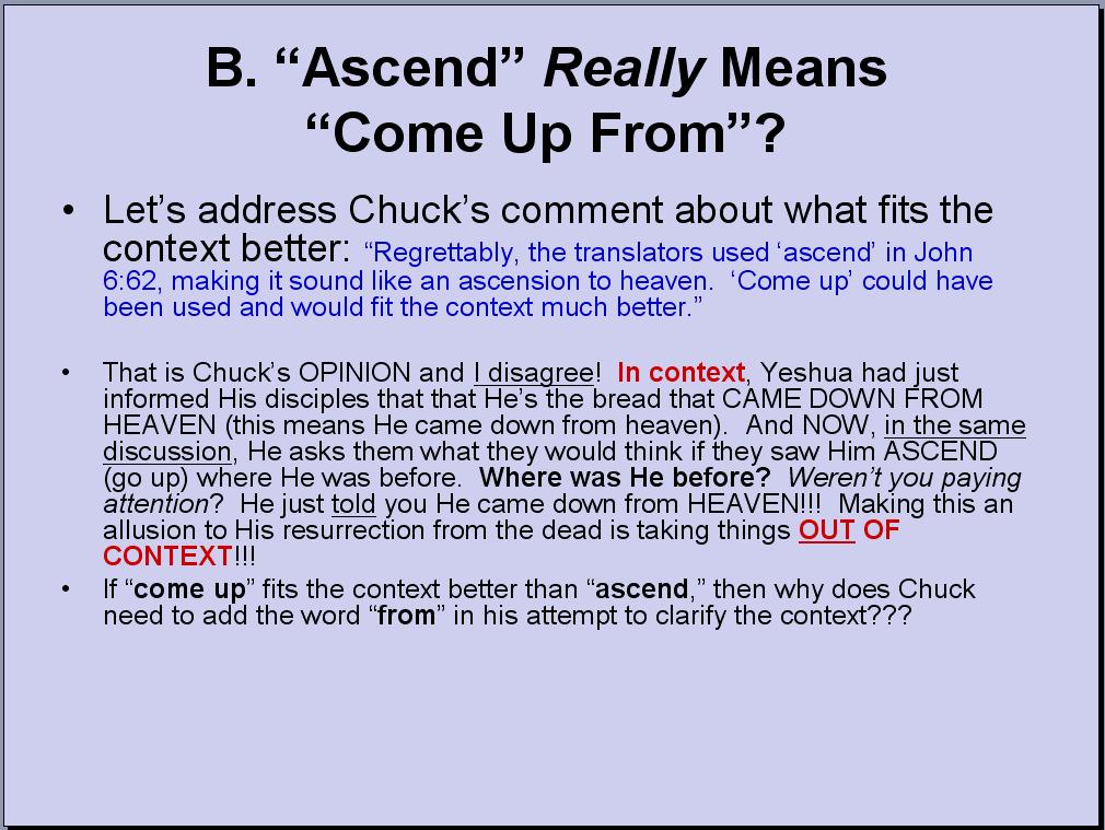 11. Let me be clear: I completely reject Chuck’s teaching that the context of John 6:62 has to do with Yeshua “ascending from the grave.” Chuck’s scenario is “OUT OF CONTEXT” and I further reinforce this understanding with my next PowerPoint slide: