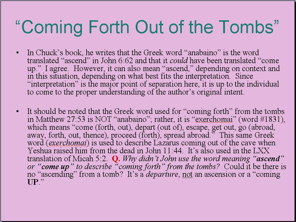 6. You can read the first edition of Chuck’s book from “cover to cover” and you won’t find him using the phrase “ascend from the grave.” I sense it’s because he knows how unusual and even odd such a word construction is. Phrasing it “come up from the grave” suits the word sense much better, even though the Greek word in question, anabaino, is never used in the sense of “coming up from the grave.” Although Chuck doesn’t use the phrase “ascend from the grave” in his book, he did use it during the private debate held in our home in March 2019. Our debate presentations were included with the video as per my special request, which was honored on that particular occasion, and here’s a screen capture from Chuck’s presentation on anabaino: