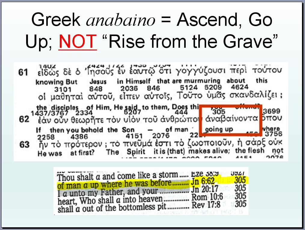 15. The Greek word anabaino, which Chuck wants and needs to mean “rise from the grave,” is never used in that context in the Bible. Instead, we see forms of the Greek word anistemi being used for “rise from the dead” in such verses as John 20:9. In terms of “coming forth” from the grave or tomb, we see the Greek word exerchomai. If this word comes close to sounding like our English word exit, it’s more than a coincidence. Exerchomai means such things as “depart,” “come out of,” “get out,” “proceed forth,” etc. The point I bring out in the following PowerPoint slide is the fact that anabaino is simply not a Greek word used to express either “rising from the dead” or “rising from the grave”: