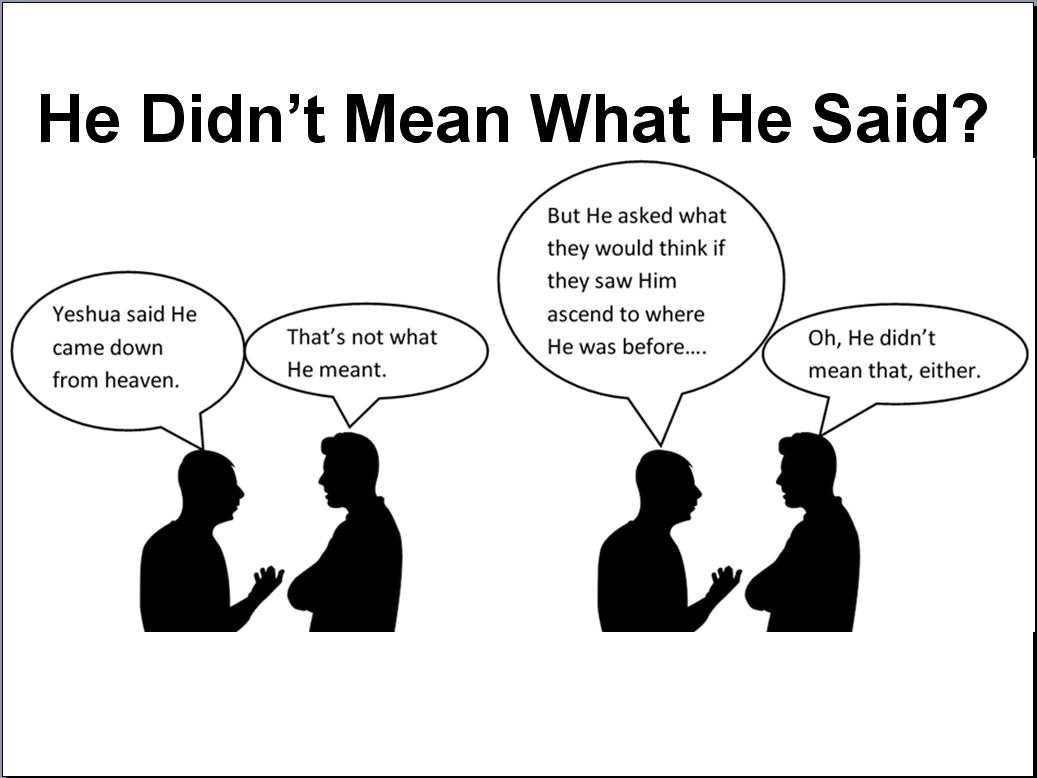 9. This was another PowerPoint slide I created to further reinforce the dangers of “changing up” what people say. Many have shared my own experiences of how sometimes our words are either misconstrued or distorted. Sometimes it is done in all innocence of heart, in which case we overlook the mistake and move on. Sometimes, however, it is done with ulterior motives. At first, assumed that Chuck’s misconstruing Yeshua’s words and the context of “where He was before” was done in innocence. However, when he adamantly defended his understanding over and above mine to the point that he’s fine with his “added” words for “clarification,” I realized this is more than a case of misconstruing words.