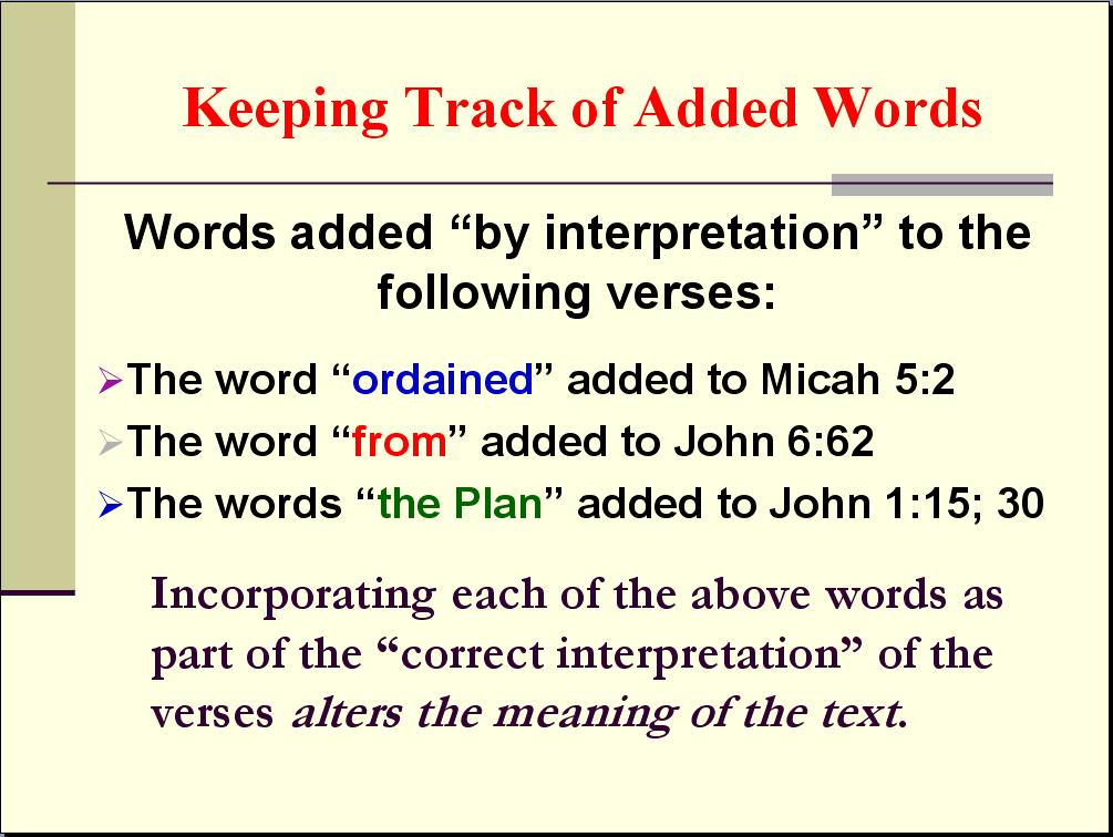18. Finally, for those attempting to keep track of the words that Biblical Unitarians need to add in order to manipulate Bible texts to mean what they want them to mean, here’s a slide I saved from our March 2019 debate:
