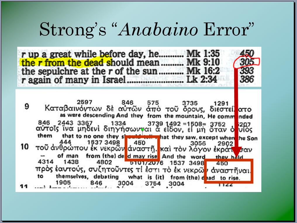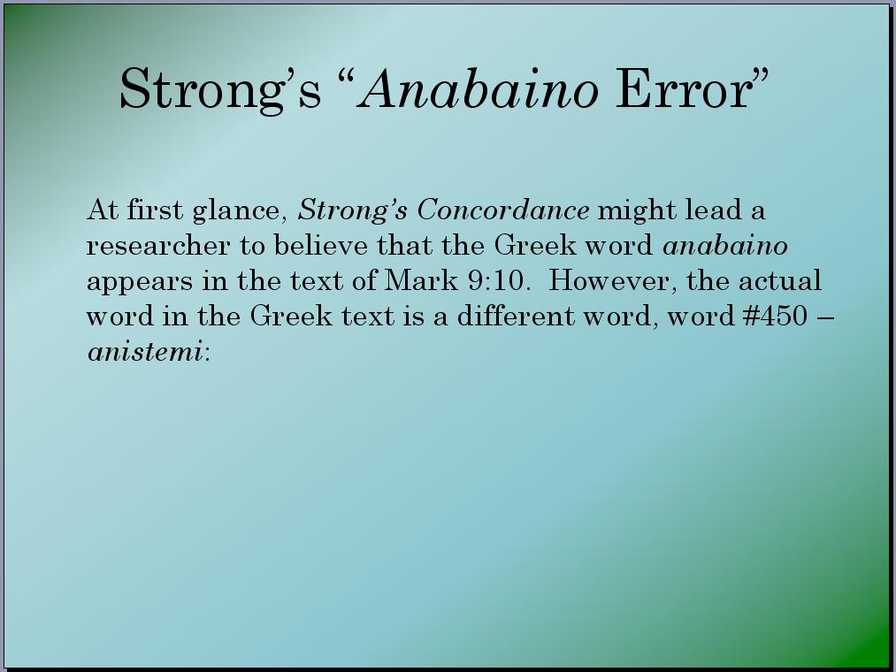 During the private debate I had with Chuck in March 2019, there was some discussion about anabaino being used to refer to “rising from the dead” in Mark 9:10. Although the debate was recorded, I am unable to locate Chuck’s precise comments, which at the time seemed to justify believing that anabaino can be used to refer to either “rising from the dead” or “rising from the grave.” Chuck cited this “fact” while pointing to Strong’s Exhaustive Concordance of the Bible, which lists Greek word #305 as the word from which “rising” is translated in Mark 9:10. It turns out this is one of the rare instances in which Strong’s Exhaustive Concordance of the Bible made a mistake. Let’s take a look at the verse in question so as to get a clear picture of the error perpetrated by James Strong when he compiled his famous concordance. Displayed below is Mark 9:9-10: 9 And as they came down from the mountain, he charged them that they should tell no man what things they had seen, till the Son of man were risen from the dead. 10 And they kept that saying with themselves, questioning with one another what the rising from the dead should mean. Both highlighted words above are translated from the Greek word anistemi, which literally means “arise” or “raise.” This word is word #450 in Strong’s Exhaustive Concordance of the Bible and Strong’s correctly identifies the word “risen” in verse 9 as being anistemi. However, when you look up the word “rising” in Strong’s, it is listed as being word #305 (anabaino), which as we know by now, means “ascend.” This error gave Chuck the “window of opportunity” that he needed to present an “irrefutable” argument. At the time, I had no answer because surely the concordance couldn’t be wrong! Yet it is wrong. I put together the following slides as part of an unused PowerPoint presentation to demonstrate Strong’s error. Here’s my introductory slide: