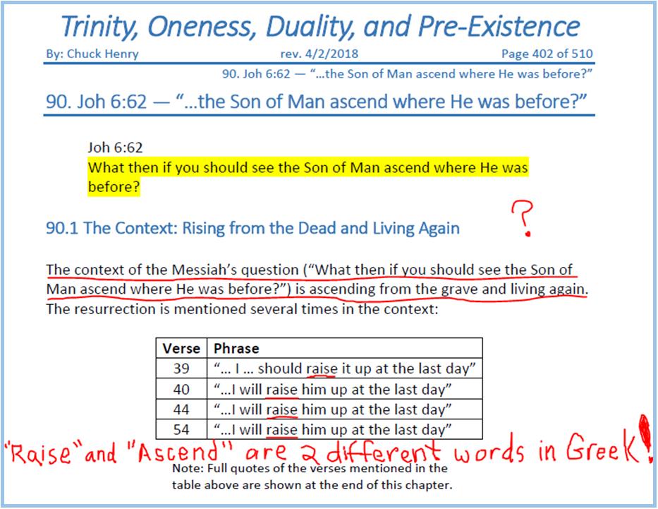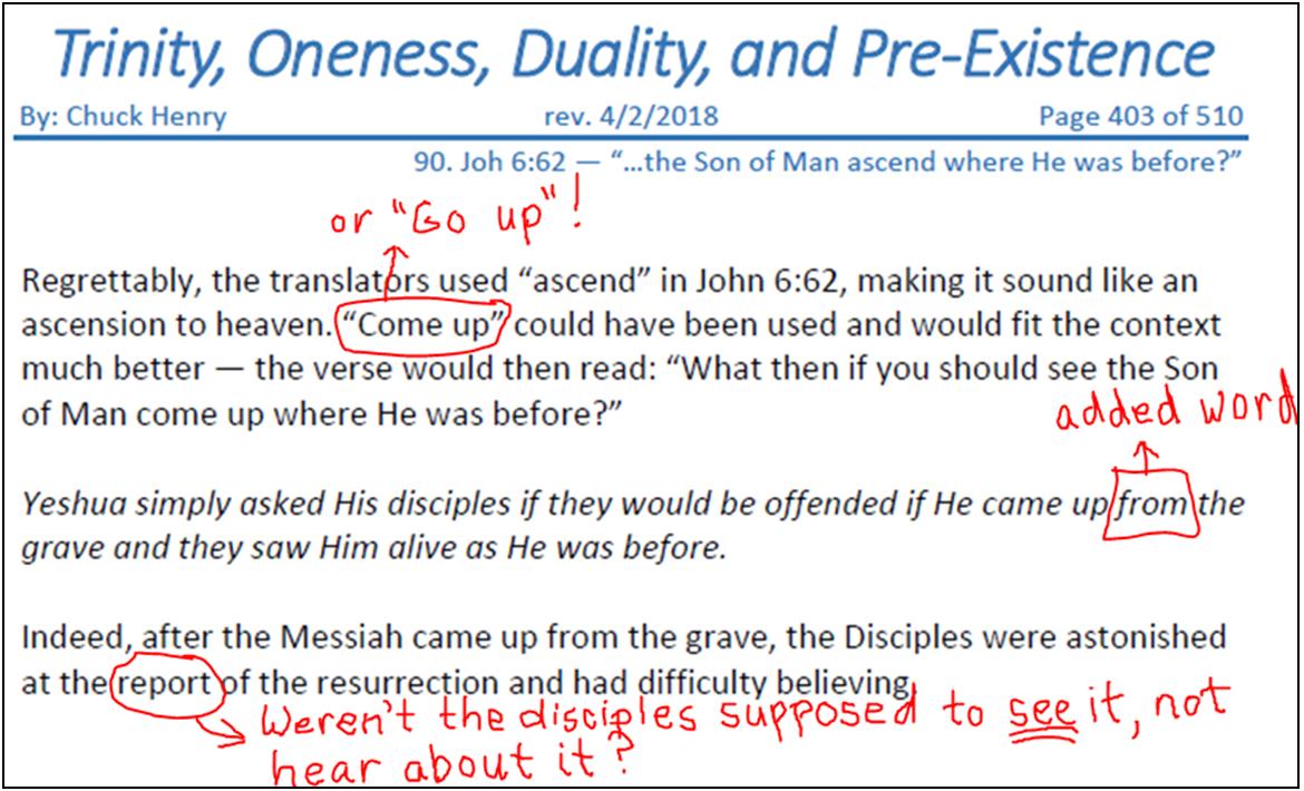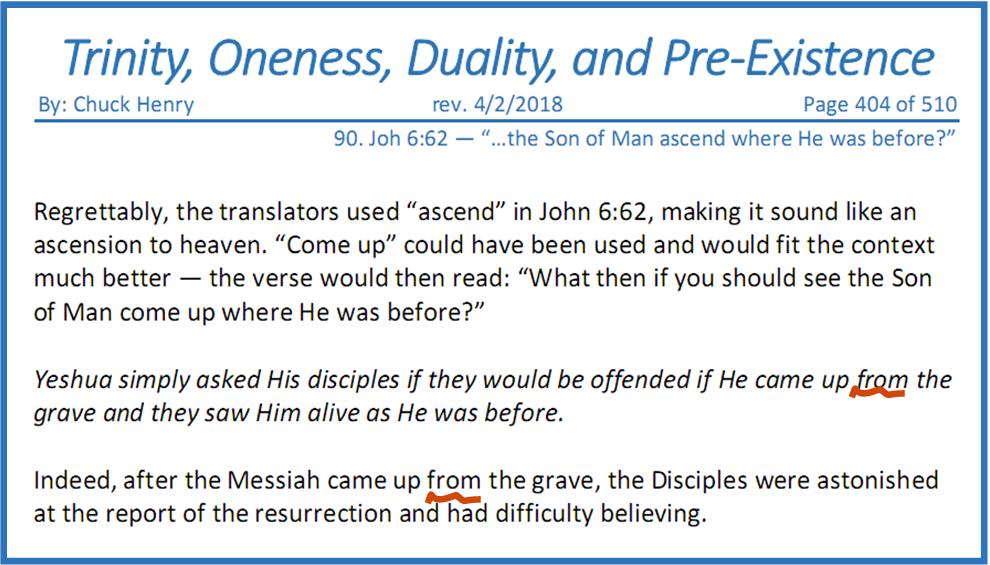 that came down from heaven,” So what did Yeshua mean when He asked, “What and if you shall see the Son of Man ascend up to where He was before?” If Biblical Unitarians thought they had a difficult time spinning the “true meaning” of Yeshua’s words when He said He’s the bread that came down from heaven, think of their consternation in trying to figure out what He “really meant” when He asked His disciples what they would think if they saw Him ascend up to where He was before! The problem is, those words from Yeshua, in and of themselves, disprove Biblical Unitarian doctrine, so the discussion should be over. However, unlike the Biblical Unitarian Ebionites who simply rejected the book of John, 21st century Biblical Unitarians spin the book of John and if we aren’t careful, we’ll fall into the same trap they’ve chosen to enter. It is now time to examine, once again, how and why Biblical Unitarians teach Yeshua didn’t really mean what He said. That’s why this chapter of our study is here. I’m trying to think of how Yeshua could have been clearer about FROM WHERE He descended and TO WHERE He was going to ASCEND. In spite of His clarity, Chuck Henry says that’s not what Yeshua meant. According to Chuck (paraphrasing), what Yeshua meant is, “What would y’all think if I came up from the grave and [then] you see Me alive as I was before?” Again, according to Chuck, I misunderstand Yeshua’s words because when He said, “What and if you shall see the Son of man ASCEND UP where He was before?” what He MEANT was, “What and if you shall see the Son of man AFTER He’s risen from the grave and is alive as He was before?”[1] As shocking as all this is, Chuck goes on to say his understanding of what Yeshua meant “fits the context” of John chapter six. No other understanding, at least in Chuck’s book, is even worthy of discussion. Here’s a screen capture from the pertinent page of Trinity, Oneness, Duality, and Pre-Existence:[2] I admit I somewhat “tainted” the screen capture with my red underlining and comment, which I composed out of utter disbelief over what I was reading: