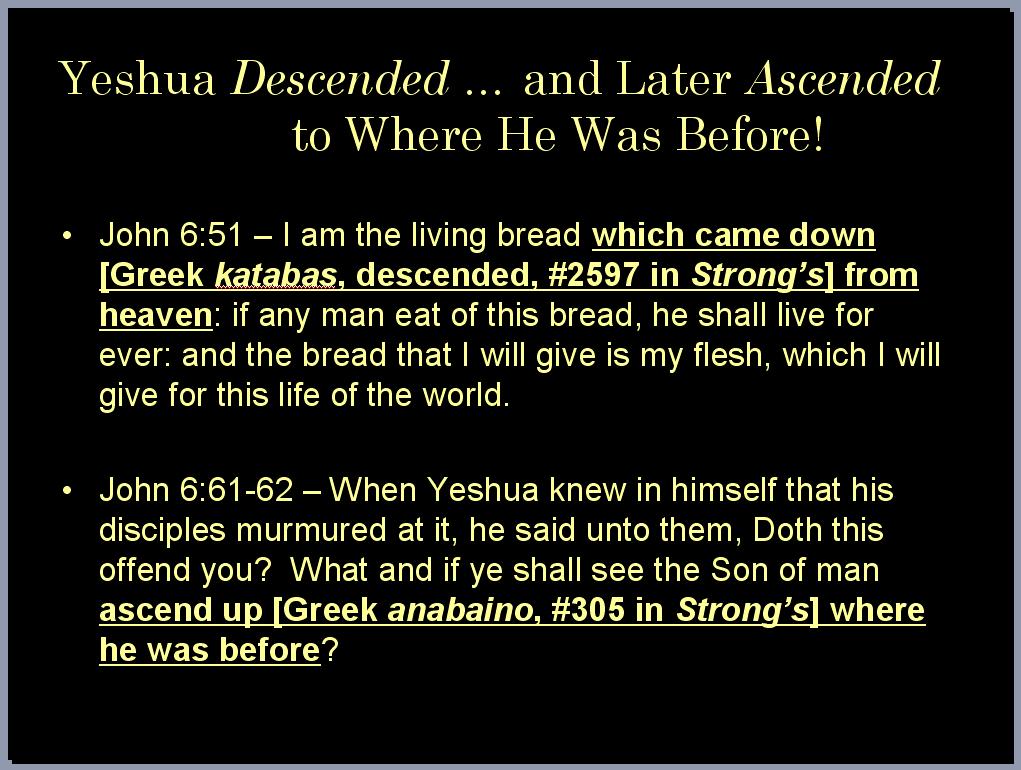 For those of you who may still be “on the fence” about this issue, try looking at it this way: If we remove Chuck’s added word “from,” what do we have? With the added word “from”: “Yeshua simply asked His disciples if they would be offended if He came up from the grave and they saw Him alive as He was before.” Without the added word “from”: “Yeshua simply asked His disciples if they would be offended if He came up the grave and they saw Him alive as He was before.” 13. I’m slipping this PowerPoint slide into this study because I think my point is valid and worthy of consideration: “Indeed, if Yeshua was trying to find out what His disciples would think if He came up FROM the grave, He would have used the word ‘FROM” – but He did not!” He likewise didn’t use the word “grave,” the topic is more about living than dying, especially since He says, “I am the LIVING BREAD which came down from heaven” in John 6:51. Yes, Yeshua told them, “He that eateth Me, even he shall LIVE by Me,” but the overall context is that all who truly hunger and thirst after righteousness can come to Him and He will give them everlasting LIFE. This chapter is about LIFE, not about “coming up from the grave”: