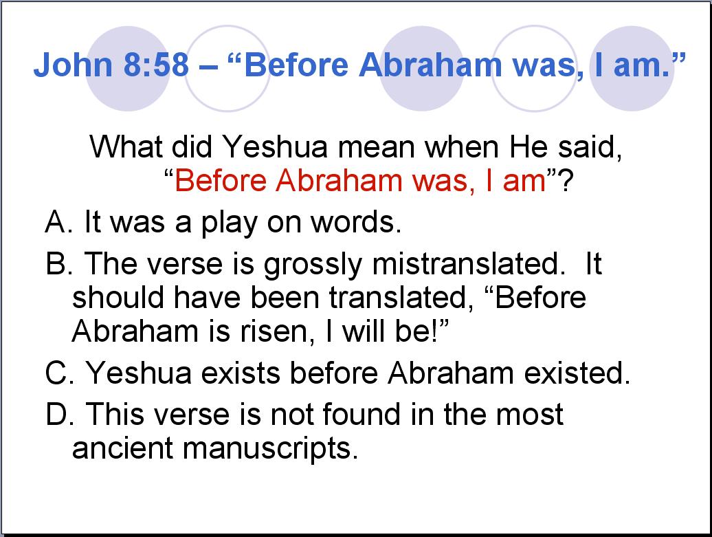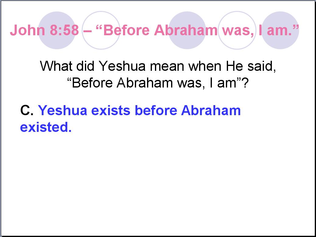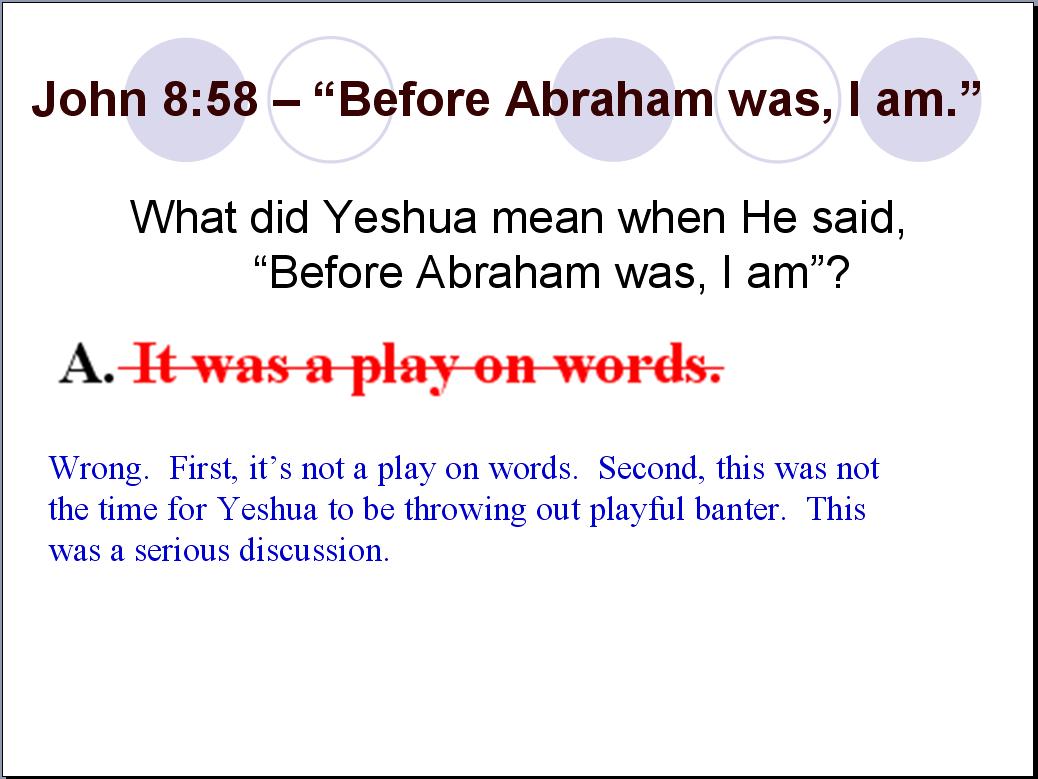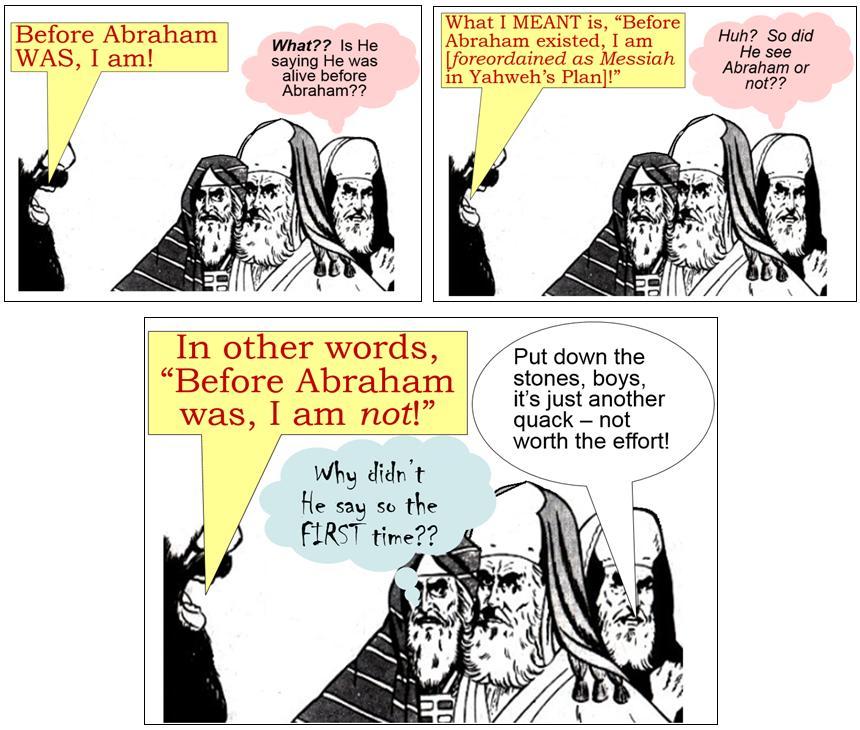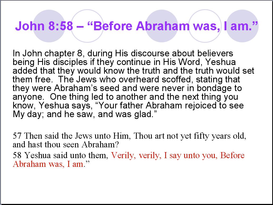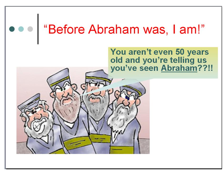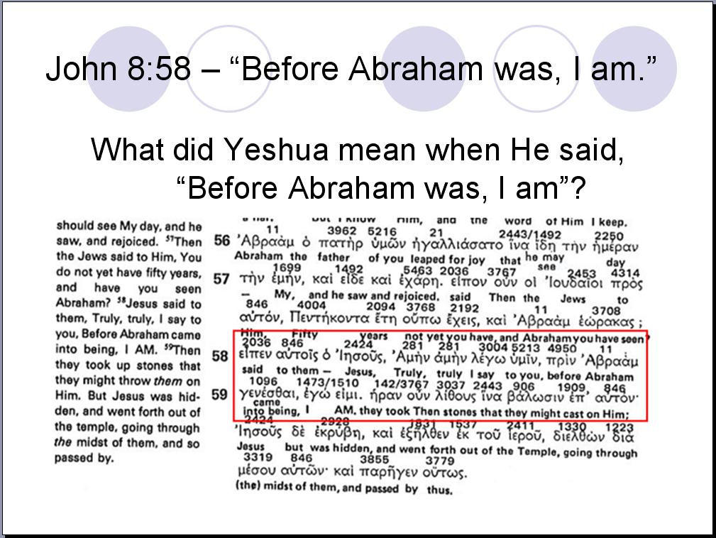 I propose that we stick with what Yeshua actually said. What Chuck offers is a gross interpretational addition of words or as they say, “Putting words in Yeshua's mouth.” The Jews’ question had NOTHING to do with whether or not Yeshua was claiming to be the ‘prophesied Messiah.’ The question had to do with whether or not Yeshua had seen Abraham. What was Yeshua's answer? Was it, “Before Abraham was, I was ordained to be the Messiah”? Or was it, “Before Abraham was, I am”?