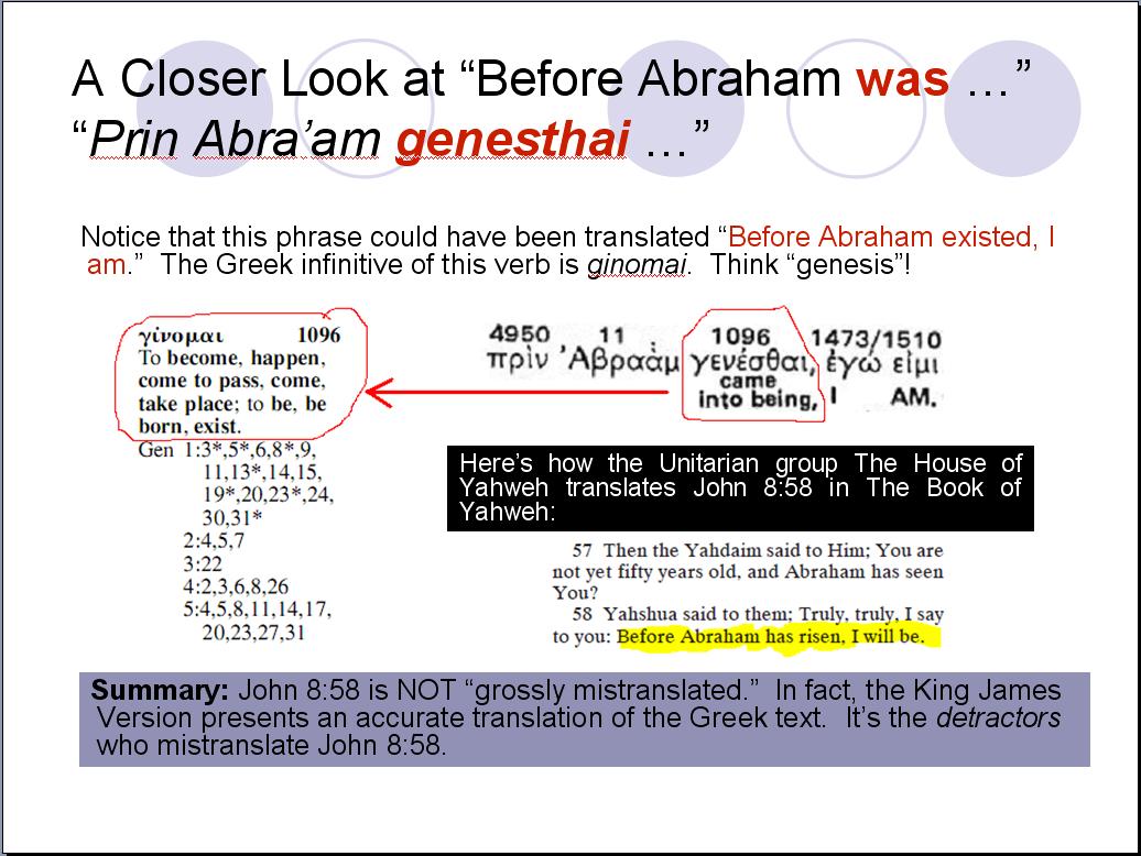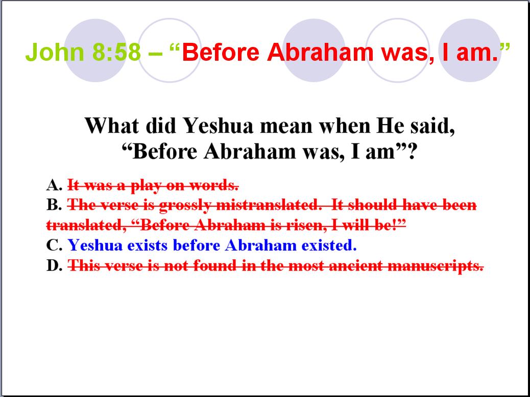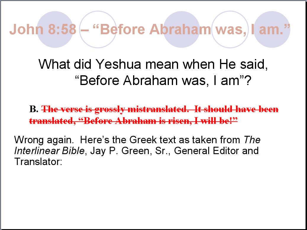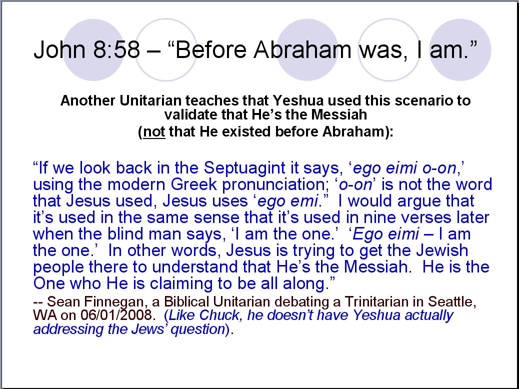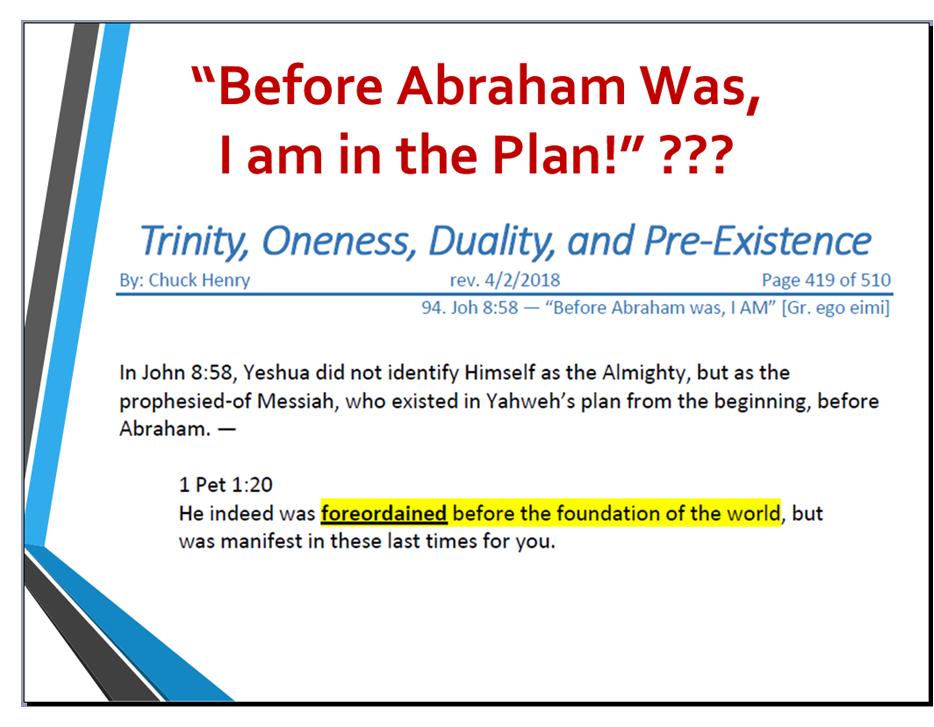 Some additional slides from my originally-planned presentation: What follows are slides that were a part of my originally-planned presentation that took place with the “warm-up” debate I had with Chuck Henry on March 9, 2019 here in our home. As I have previously mentioned, most of my spare time prior to that debate was spent researching and compiling evidence. Very little time was devoted to assimilating and condensing my material into a 30-minute presentation. For some reason, right up to the final week I thought I would be able to accomplish that “minor” task – a huge miscalculation on my part. I even thought I would be able to do condense things in the hours prior to our scheduled start. However, shortly before Chuck’s arrival, I realized I had a time constraint dilemma that I was unable to resolve in time for the start of our debate. I knew I would only be getting warmed up by the time my 30 minutes expired. I didn’t want to leave anything out of my presentation, and Chuck graciously agreed to my last-minute request to change our opening presentations from 30 minutes to two hours – a total of four hours! As it turns out, two hours was still not enough time for me to present everything I had and this very topic – “Before Abraham Was, I Wasn’t” was left completely unaddressed. For some reason, I completely forgot I had the following slides after our “warm-up” debate. I even forgot them when I originally composed this study in June 2020. It wasn’t until a couple of months later that I stumbled across them while reviewing my original PowerPoint presentation. Most of them speak for themselves: