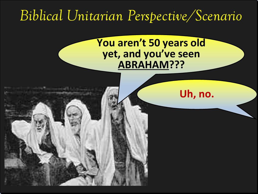 Apart from the word “Uh” in the preceding illustration, here’s the only direct answer that Biblical Unitarians could possibly have Yeshua give to the Jews’ question: “No.” If the Jews came away with Chuck Henry’s understanding of Yeshua’s answer, they would not have picked up stones to stone Him because He would have been just like them – having had an existence that didn’t begin until their physical births as flesh and blood human beings.