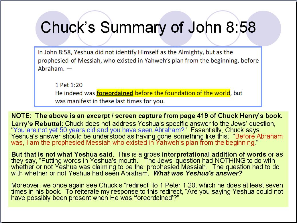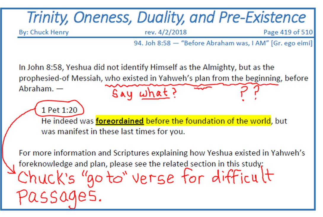 Chuck Henry and I agree that Trinitarians (mistakenly) turn to John chapter 8 to prove that Yeshua is eternal, but that’s not what it says. In verse 56, Yeshua told the Jews, “Your father Abraham rejoiced to see My day: and he saw and was glad!” The Jews mocked Yeshua at this point. Let’s read the remaining portion of their discussion: 57 Then said the Jews unto Him, Thou art not yet fifty years old, and hast Thou seen Abraham? 58 Yeshua said unto them, Verily, verily, I say unto you, Before Abraham WAS, I am. 59 Then took they up stones to cast at him: but Yeshua hid himself, and went out of the temple, going through the midst of them, and so passed by. Note that Yeshua wasn’t claiming to be the Supreme Most High Yahweh, nor was He claiming to have existed from eternity. He was only stating that before Abraham was, He IS. When Yeshua stated, “Before Abraham WAS, the Greek word translated “was” is the Greek word “ginomai,” which means “to come into being.” It’s the same Greek word from which we get the word “Genesis.” So Yeshua stated, “Before Abraham came into being, I am.”[1] The Jews understood precisely what He meant. Chuck, I’m sorry to say, does not. You can read Chuck’s conclusion of what Yeshua meant on page 419 of his book. He writes, “In John 8:58, Yeshua did not identify Himself as the Almighty, but as the prophesied-of Messiah, who existed in Yahweh’s plan from the beginning, before Abraham.” This interpretation is nothing short of an incredible, outlandish claim – a claim so bizarre that I couldn’t believe my eyes when I read it. But it’s there in his book and the above is a screen capture to prove it. As I’m sure you’ll notice, I couldn’t resist throwing in some commentary of my own.