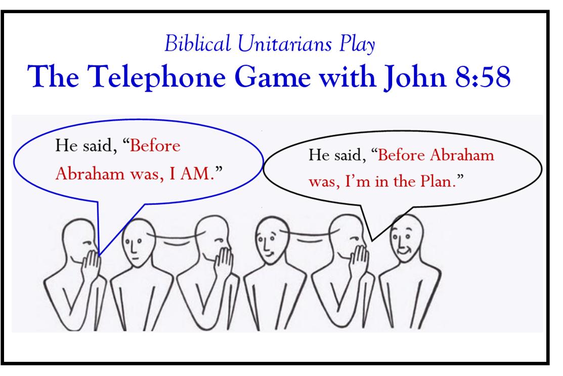 I would compare what Chuck does to Scripture with The Telephone Game, except for one huge difference: The “final” message Chuck comes up with is not hilarious or funny at all. In this particular situation, Yeshua throws a hint to the parties involved that He had seen Abraham. His fellow Jews are stunned. When they ask for clarification, Yeshua states, “Before Abraham was—before Abraham came into being—I AM.” That’s what Yeshua said. But by the time Yeshua’s message makes it to Chuck, he says we misunderstand what Yeshua said and what He meant. What Yeshua meant, according to Chuck, is “Before Abraham was, I am the prophesied-of Messiah, who existed in Yahweh’s plan from the beginning of time, before Abraham.” So according to Chuck, Yeshua didn’t mean for the Jews to understand that He literally existed before Abraham did; no, His existence was in a “Plan.” Let's just suffice it to say I don't recommend playing The Telephone Game with Biblical Unitarians.