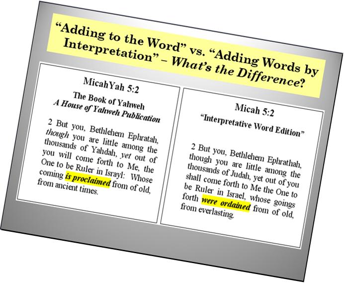 coming A group down the road from here who shares Chuck Henry’s belief that Yeshua did not pre-exist puts out their own Bible in which they outright add to the text of Micah 5:2 in order to make it say that the Messiah’s coming (not origin) was foretold from of Old, which is pretty much the same as saying it was ordained from of Old. Not much of a difference. This is blatantly adding to the Word in order to make it say what you want it to say in order to justify your belief. Chuck doesn’t put out his own Bible, but in a way he does the same thing by telling his readers that what Micah 5:2 really means is, Yeshua’s ORIGIN began at conception in Miriam’s womb and that THIS origin is what was ORDAINED from of Old.