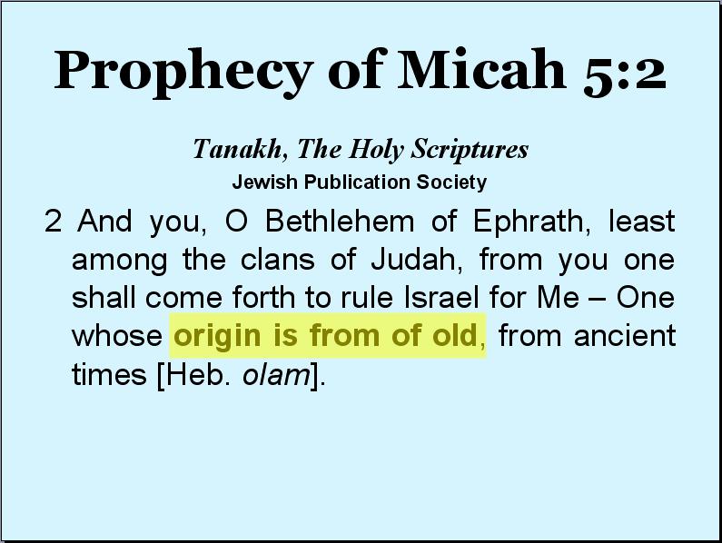 otherwise.For example, we read in the Old Testament a prophecy that a Ruler shall come forth unto the Almighty from out of Bethlehem, a Ruler whose ORIGIN is from of old, from ancient times. This prophecy, written hundreds of years before Yeshua’s birth in Bethlehem, doesn’t state that His origin will be from of Old; it doesn’t say His origin is ordained from of Old; instead, it asserts that His origin is from of Old, from ancient times. Again, this comes from the Old Testament and the book where this prophecy is found is Micah. If we allow the prophet Micah to give us the prophecy without any interpretational add-ons and without any interpretational infusions from interpretations of New Testament passages, Micah tells us there will be a future Ruler whose origin is from ancient times.