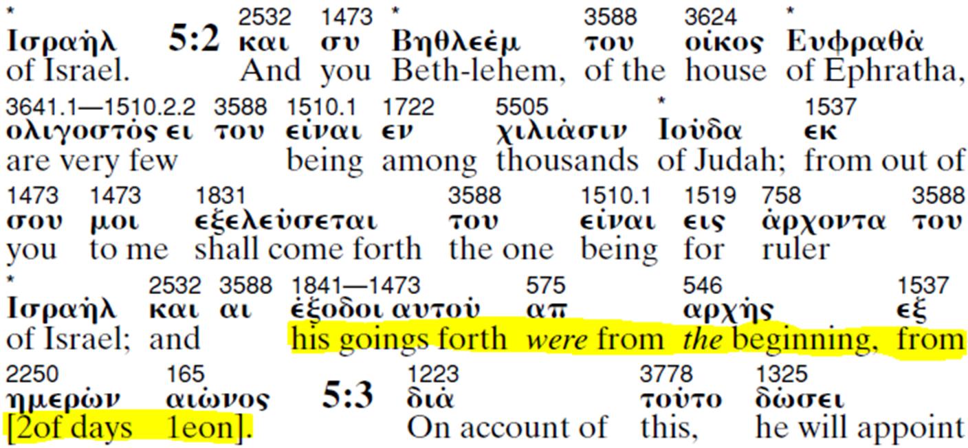 more; nevertheless, it can be used to dem On the other hand, if I knew the coming Messiah is prophesied to have an origin that’s from of Old, from ancient times, then I would have no choice but to understand that Micah’s prophecy means exactly what it says without any need to insert any extra words, either by interpretation or otherwise. The question wouldn’t be whether or not He had a pre-carnal existence; rather, the question would be, “Who is the Messiah?” And that, indeed, is the primary line of demarcation separating Christianity from modern Judaism. Okay, back to my original pre-debate presentation: The Hebrew scholars who translated the Septuagint into the Greek language understood that the coming Ruler’s “goings forth” are from the beginning, not “ordained from the beginning.” Displayed below is the Septuagint’s rendering of Micah 5:2:[2]
