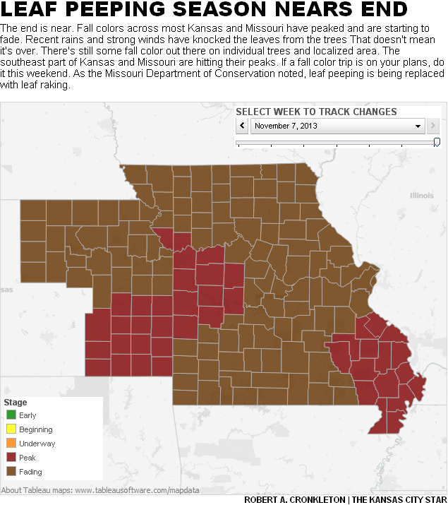 is near. Fall colors across most Kansas and Missouri have peaked and are