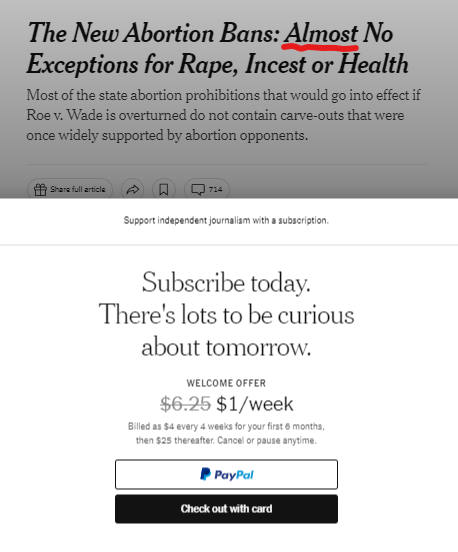If you look closely at the attack ad on the left, they list their source of information as the June 9, 2022 edition of The New York Times. I tried accessing the full article, but since they require a subscription that I'm not willing to pay, I was only able to read the headline. That headline, in and of itself, proves the deceptive, disingenuous nature of the attack ad. The actual headline reads, "The New Abortion Bans: Almost No Exceptions for Rape, Incest or Health." But Colin Allred cunningly and deceptively omitted the word "Almost" from the headline: