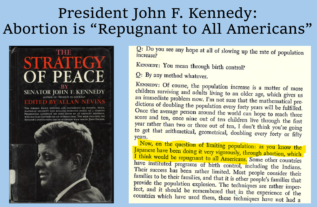 John F. Kennedy is arguably our nation’s most famous Democrat. In his book The Strategy of Peace, he wrote, “Now, on the question of limiting population: as you know the Japanese have been doing it very vigorously, through abortion, which I think would be repugnant to all Americans.” I agree with Kennedy’s statement. I’m well aware of reports that he may have secretly paid for mistresses’ abortions, which if true, is truly sad, but nevertheless, in his statement, he exhibited understanding of the correct moral code. Hypocrisy does not constitute approval of incorrect behavior. I remember the days when abortion truly was repugnant to Americans–at least the ones I observed and associated with during my childhood days.