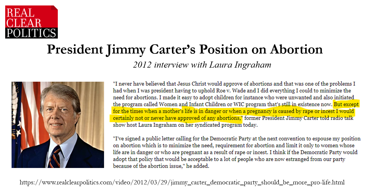 Sadly, today's Democratic Party does not espouse Jimmy Carter’s expressed position on abortion. The Republican Party does, but they have failed to establish a clear goal of appeasing the concerns of women who have been raped or whose lives are in danger. This failure, in my opinion, will likely cost them the election in November. I hope I'm mistaken!