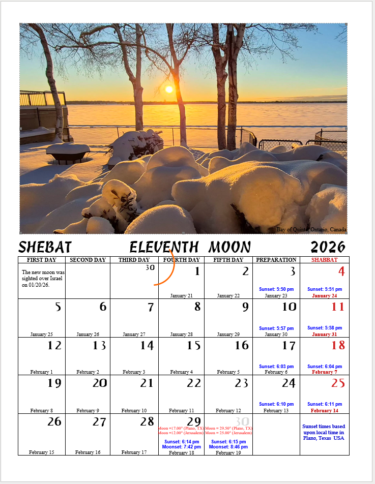 2026 Scriptural Calendar These monthly calendars are based on the ancient Jewish understanding of sighting the new moon over Israel, with the first month of the year being the first new moon sighted on or after the day of the vernal equinox. The Eleventh Scriptural Month (Shebat)