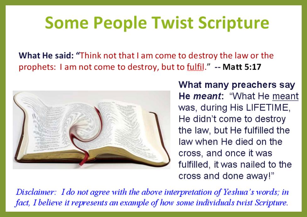 I close this chapter with the screen capture of a slide that wasn’t incorporated into my debate presentation, but it supplies an example of how some preachers subvert the Bible. I covered one particular example of Matthew 5:17 in chapter seven of Part I. It’s an example that was thrown at me by a preacher early in my Sabbathkeeping days and it caught me off guard. The preacher, much like Chuck, was fully persuaded that he knew what Yeshua “really meant.” In this case, Chuck is persuaded he knows what Micah 5:2 “really means,” even though what he says it “really means” completely alters the meaning of the actual words of the prophecy. Once I examined the preacher’s claim in the light of context, as well as practice and belief of early believers like the Apostle Paul, John and James, I realized that he was subverting Yeshua’s words, i.e., twisting Scripture. It wasn’t a case of what Yeshua “really meant”; it was a case of what Yeshua “really said” and I am fully persuaded that Yeshua really meant exactly what He said. Sadly, subverting the words of the Bible, including those of Yeshua, is what I found that Chuck also does, but he doesn’t call it twisting Scripture. He calls it “textual criticism.” I need to address not only the liberties that Chuck takes with “tex-tual criticism,” but also his very use of the term. I will do that in my next chapter.