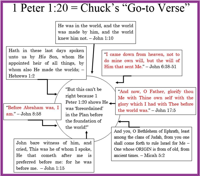 What is so ironic about Chuck’s frequent reliance on 1 Peter 1:20 is the fact that if you read and examine this verse in context and with the correct translation from the Greek text, you will see that 1 Peter 1:20 was actually written in support of Yeshua’s pre-carnal existence. Please allow me to explain.