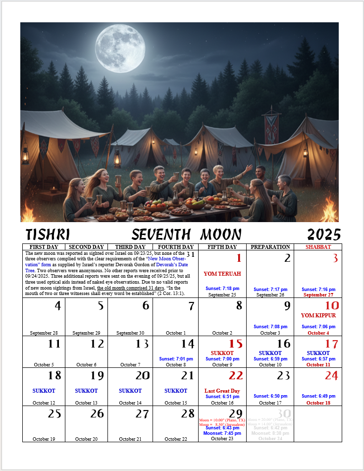2025 Scriptural Calendar These monthly calendars are based on the ancient Jewish understanding of sighting the new moon over Israel, with the first month of the year being the first new moon sighted on or after the day of the vernal equinox. The Seventh Scriptural Month (Tishri)![]() Sunset times are according to Plano, Texas local time. The date of each new month is based on the sighting of the new moon over Israel.