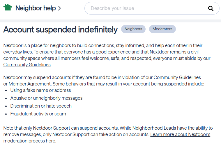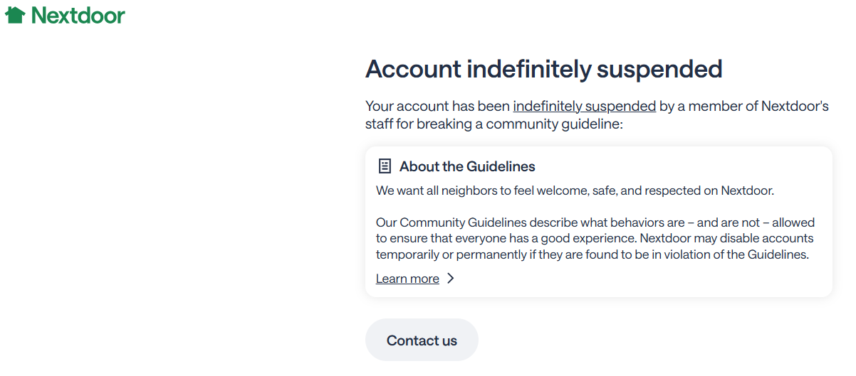NOTE: I was notified the following day (January 31, 2026) that my account with Nextdoor was “Indefinitely Suspended.” No reason specified. I'm persuaded that both David K. and I did our best to exhibit respectful behavior. As such, none of the "forbidden criteria" listed below seemed to apply to the suspension:
